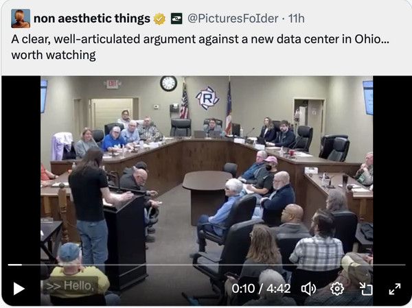 This video is an expert class in leftist propaganda from which those in attendance had zero ability to defend against. This is not a "clear well-articulated argument" as the poster claims. It is a fact-distorting, emotion driven, attempt to mislead people by fear. We heard this ALL before, 15 years ago, in Portage County when misguided people, or useful idiots like this young man, told us that Fracking would destroy your drinking water; that it would cause earthquakes; that fracking would poison our soil and should be illegal in Portage County and all over the United States. All of that was not true and was paid for by mostly foreign anti-American groups that wanted to cripple America's energy production and kill capitalism. The Portage County TEA Party and the Ohio Liberty Coalition exposed their lies then and by doing so we made the United States of America Energy Independent! How important is that Today? The same is now true with the Data Center Fear Mongering - All Paid for by China! Read about it here (Be SURE to Click the Links in the Articles for more proof):